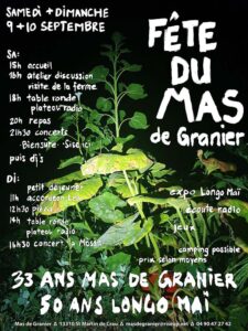 Les 9 et 10 septembre, le Mas de Granier et ses habitant-es vous invitent pour fêter leurs 33 ans de vie collective, ainsi que les 50 ans du mouvement autogestionnaire