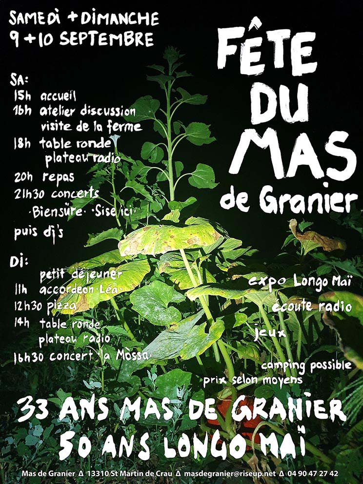 Les 9 et 10 septembre, le Mas de Granier et ses habitant-es vous invitent pour fêter leurs 33 ans de vie collective, ainsi que les 50 ans du mouvement autogestionnaire et antifasciste Longo maï !